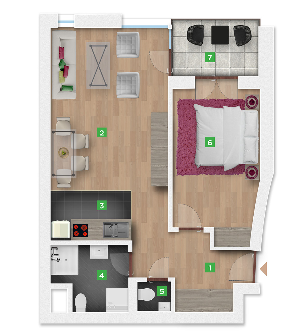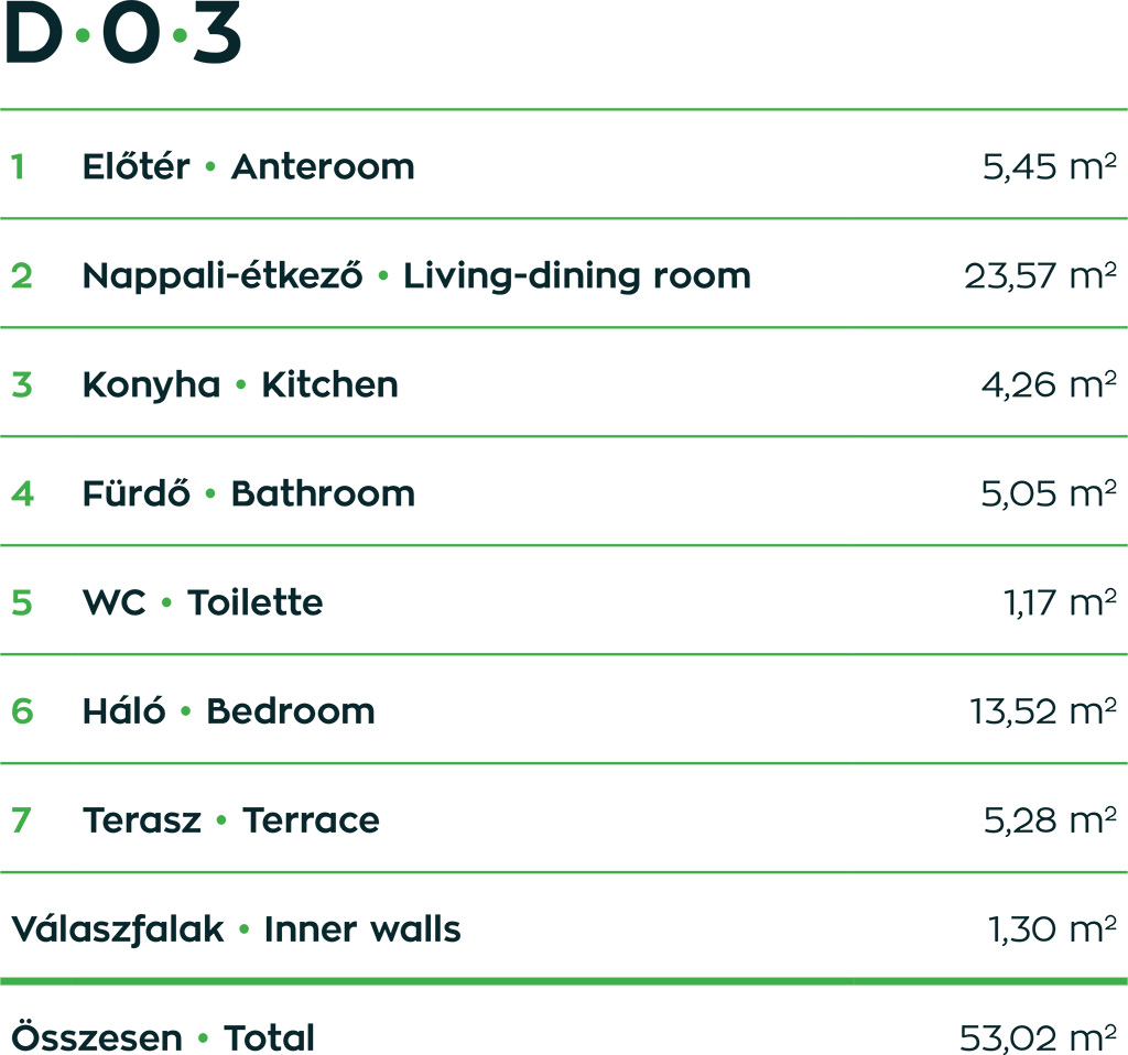 A megadott alaprajzi méretek vakolatlan falak közötti méretek, a kivitelezés során kismértékű méretváltozás lehetséges. Ezen dokumentációban közölt információk kizárólag tájékoztató jellegűek, nem minősülnek ajánlattételnek. Az alaprajzon feltüntetett bútorok tájékoztató jellegűek, azok rajzi elhelyezése nem feltétlenül tükrözi azok jövőbeni elhelyezhetőségét, illetve azok nem képzik a lakás részét.